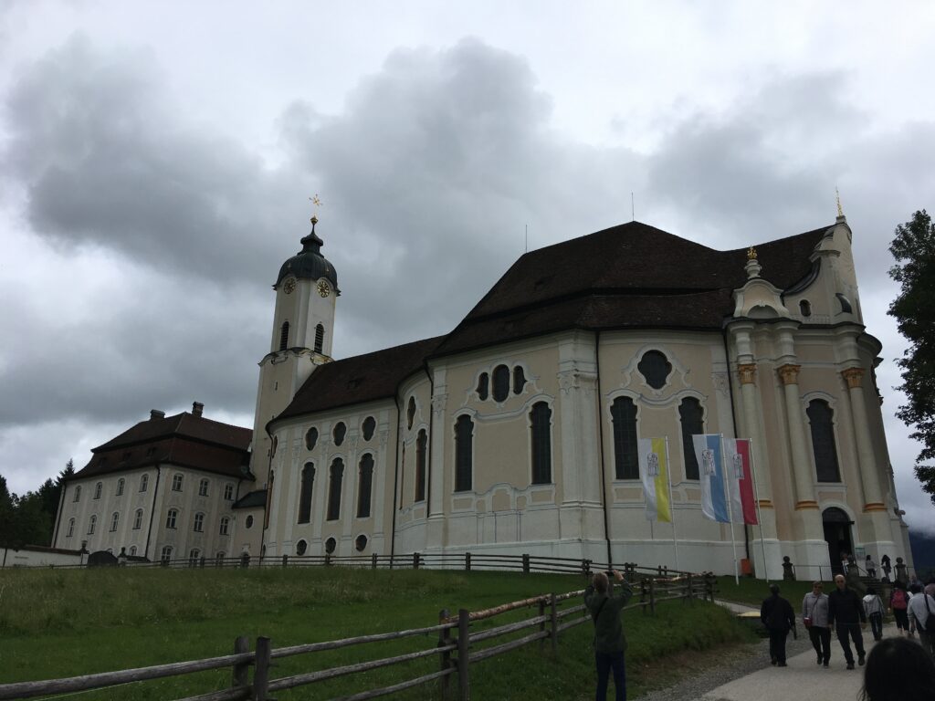 そしてヴィース教会(世界遺産) 牧歌的な場所にあり、今までとは外観は見劣りする感じあるけど、中の装飾がものすごい!!本当にすごい!! 今までの教会とは全く違った様相!! 天国のような安心感や暖かさがある装飾というか、とにかくすごかったぁ