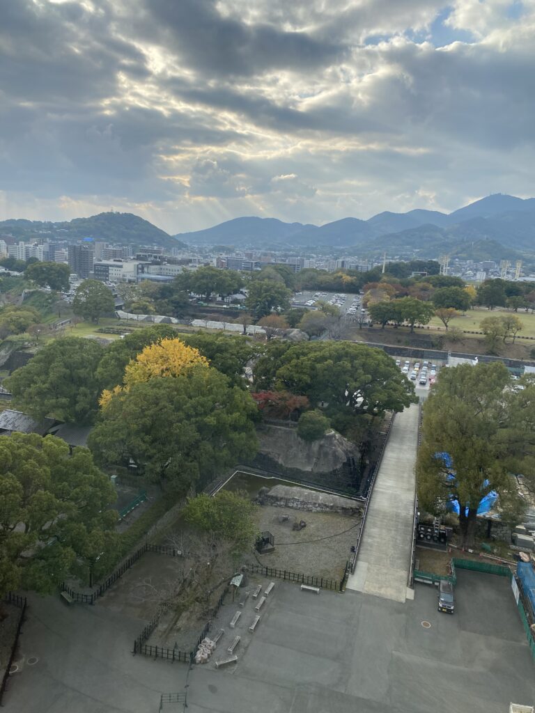 下の写真は、熊本城から見下ろした市内。天使の梯子キレイですね。11月中旬で、銀杏はところどころ黄色くなっている感じ、まだまだ緑色した銀杏の木もありました。