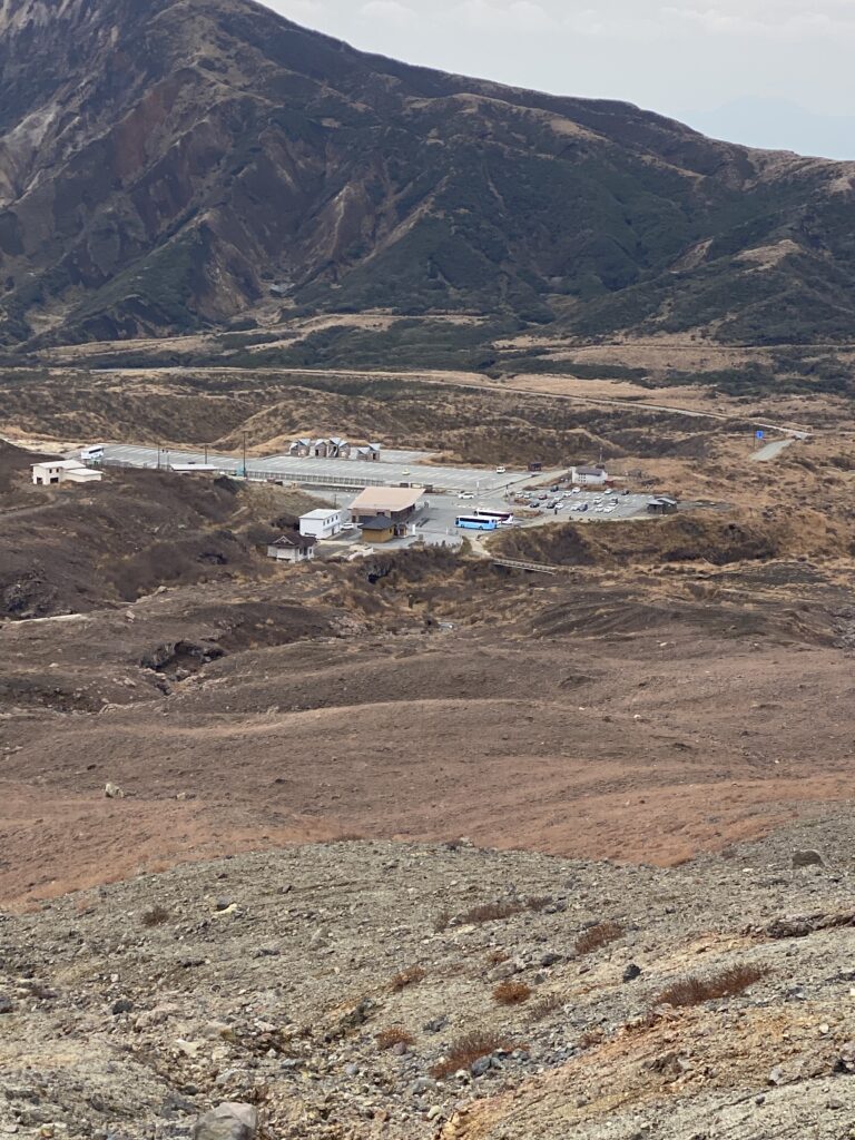 下の写真は、火口付近から見た阿蘇山上ターミナルです、近いですね。