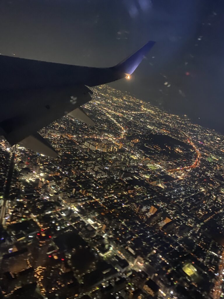 そして帰宅です。夜の飛行機は久しぶりで、夜景がキレイで思わず撮りました。