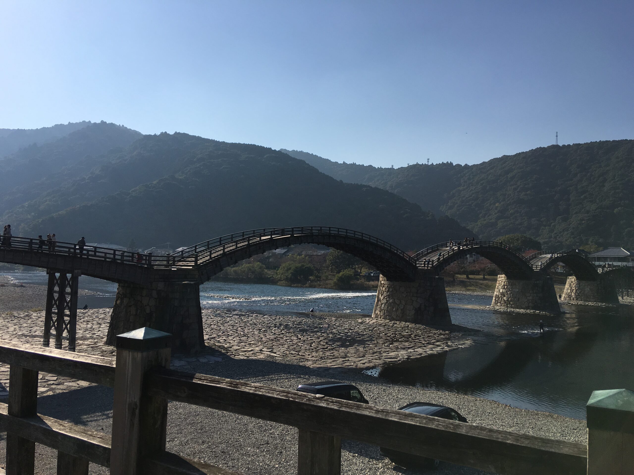 - アーチ部分は階段状になっており、一歩一歩踏みしめるたびに木の温もりと、わずかな弾力が伝わってきます。橋の頂点に立った時、目の前に広がる錦川の流れと岩国城の風景は、視界がパッと開けるような爽快感があります。
