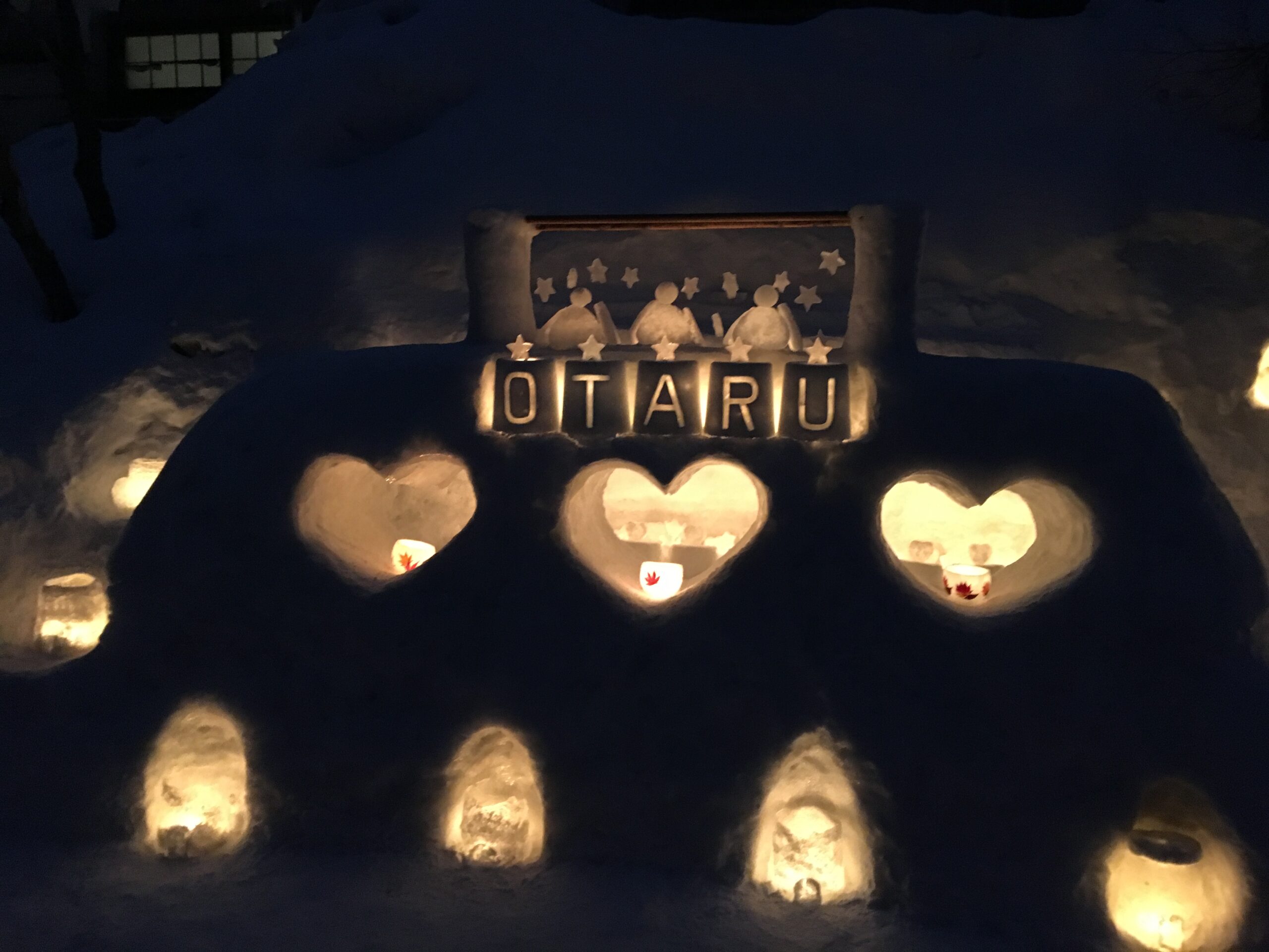 夕方5時、日が落ち始めると雪像や雪の彫刻に灯りが点灯。可愛らしい灯籠が運河沿いの道をオレンジ色に染め、幻想的な光景が広がります。「寒いからこその美しさ」を実感。雪と灯りのコントラストは、夏には絶対に見られない冬の魔法でした。